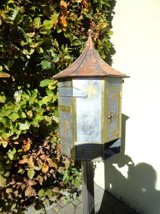 Dieser Briefkasten ist aus Titanzink, mit Messingdekoration